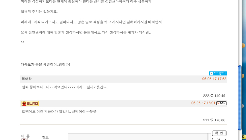 전인권 아저씨 글을 올리고서는 처음에 위와같은 악플이 달렸다가 지우고서는