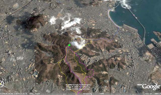 사진 속 초록점은 황령산 정상 바로 아래 포장길 매점이 있는 곳으로