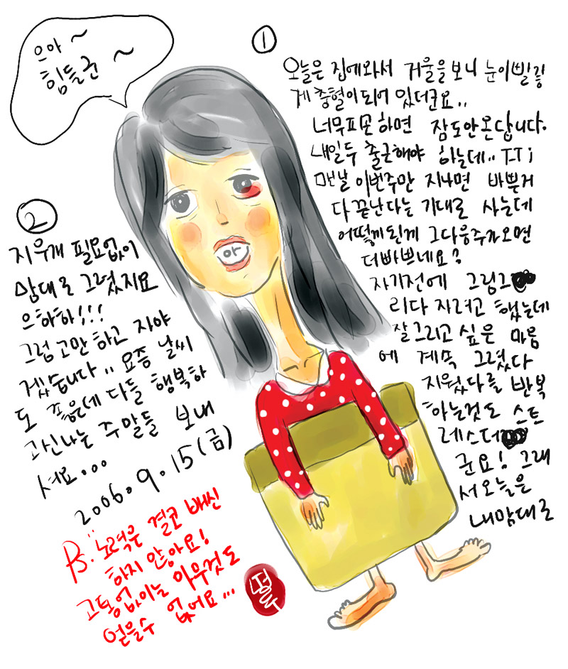 아침이오면 괜찮아지실거에..(셨죠?) 월요일이라^^; 피곤하신대도 그림그리고 주무시다니 .. 진정 프로라고 인정! 맞아요 고통없이는 아무것도 이뤄지지않죠 그중 고통없이 받는것은 다만.. '은혜'뿐이겠죠?^^ 은혜받는 한주 되세요
