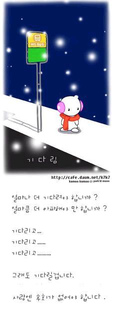 기다리지 마시오. 미련스럽게 기다리기만 하는 이유가 뭐요? 기다리던 그 자리는 미련스런 자리. 움직이시오. 달려가서 만나고, 만나서 얘기하고, 얘기한후.. 다시 집에 가야지..-_-;;; (외박하면 엄마테 머리끄댕이 쥐어뜯긴게-_-;;)