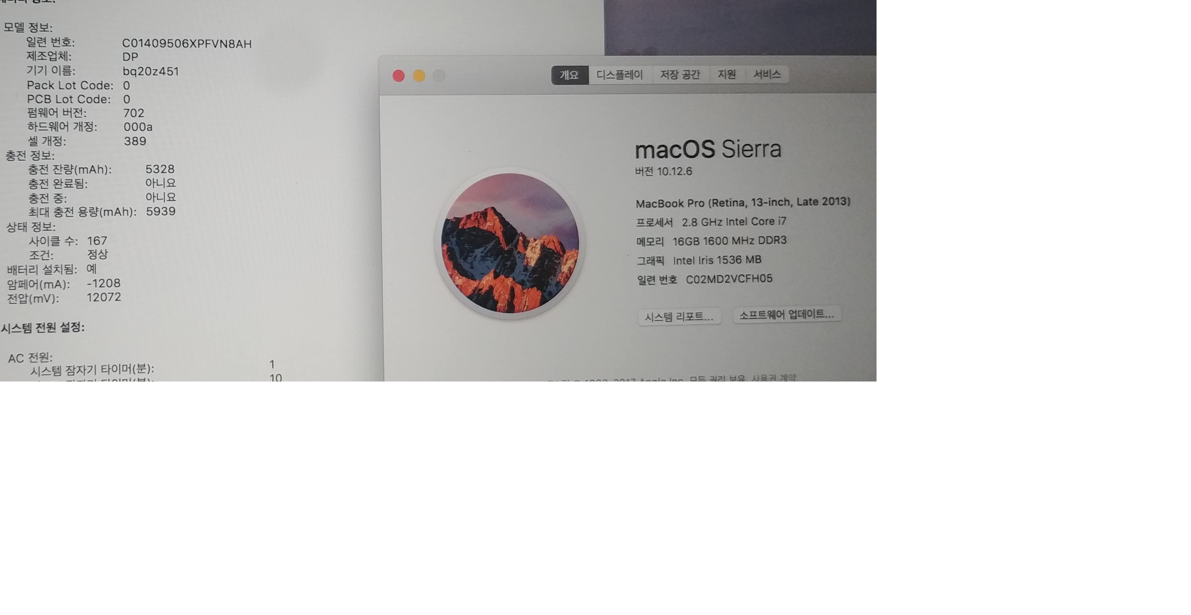 배터리 사이클 167  최대충전용량 5939