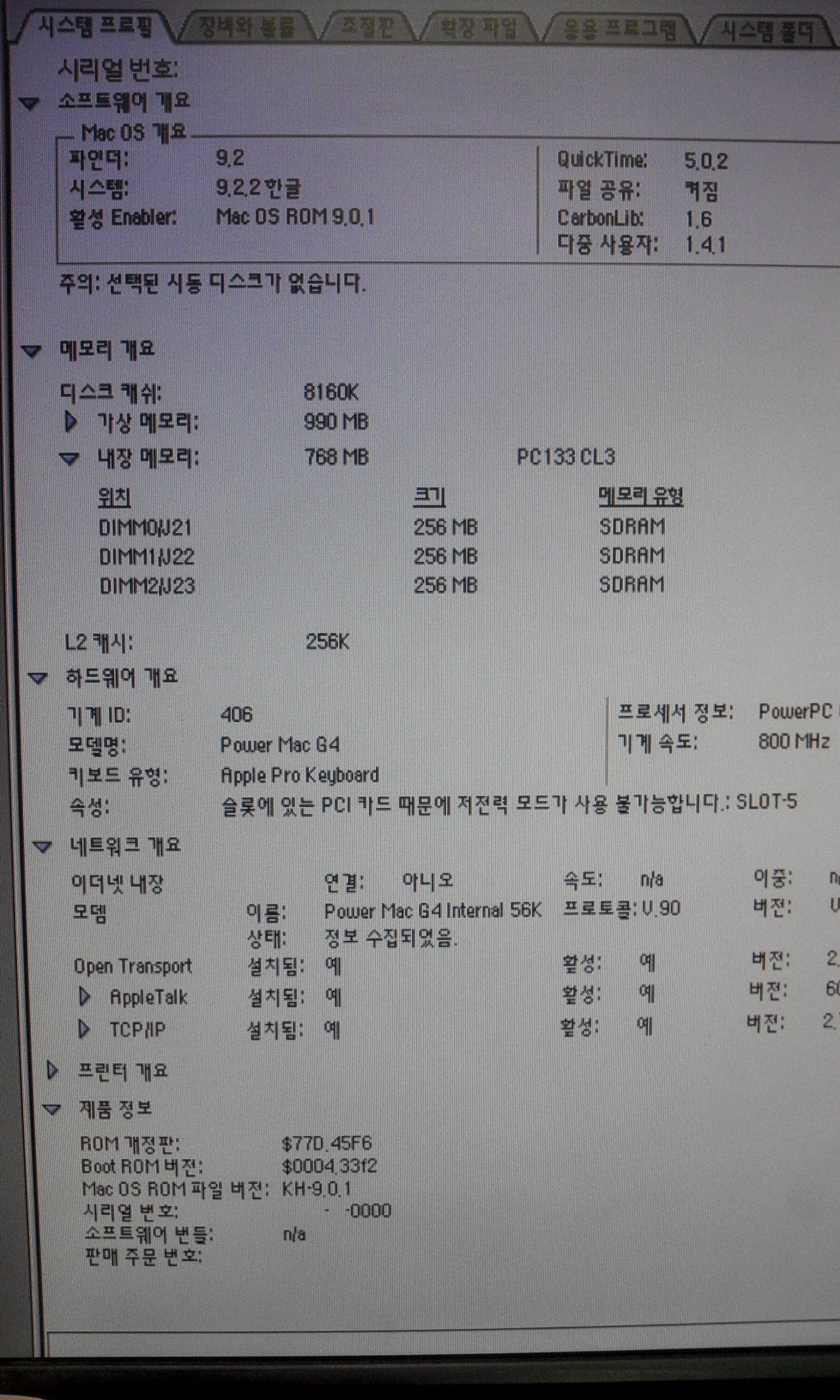 파워맥 G4 800 MHz, 768MB RAM, X, 250GB HDD (128GB로 인식), MacOS 9.2.2, ATY.RV200