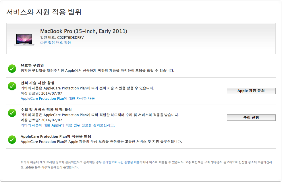 맥북프로 15인치 MC721KH/A, 맥북프로 애플케어적용