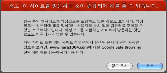 파이어폭스나 사파리로 사이트들어가니 악성코드메세지가 뜨는데...