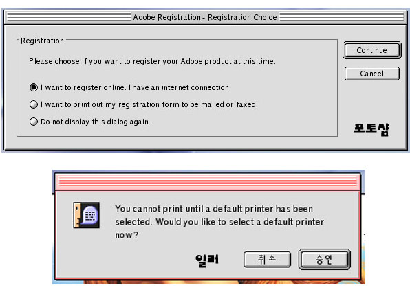 맨위에것은 포토샵을 맨처음 설치하시면 인터넷으로 회원등록을 하라는 창이 뜨는 겁니다. 맨 아래를 체크하고 계속 버턴을 누루시면 됩니다. 일러스트는 인스톨 하신게 아니고 다른 맥에 설치된 것을 복사해서 사용하는 경우 나오는 현상입니다.(프린터 셋팅을 맞추라는 겁니다.) 그냥 승인하시면 됩니다. 인터넷은 익스플로러 폴더안에 플러그인 폴더안에 필터가 없어서 지원이 안되는 다는 얘기 입니다. 익스플로러 5.1.7 버전을 설치하는 경우 필터가 없기 때문에 OS 9설치시 기본으로 설치되는 익스플로러 5에 있는 플러그인 필터를 복사해서 사용하시면 됩니다. ============== 베스트맥(아이디)를 클릭하고 자기소개를 참고하세요.