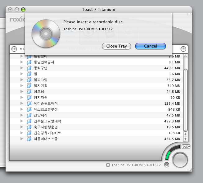 현재 사용하시는 CD-ROM은 콤보로써 DVD-RW가 안되는 모델입니다(DVD읽기만가능). 용량이 너무커서 그렇습니다. CD-RW를 사용하시려면650MB이하로 설정후 구우시고,그렇지않고 전체를 구우시려면 DVD-RW로 교체해서 구우셔야 됩니다. ++++++++++++++++++++++++++++++++++++++++++ "맥사이트(A/S점/복구)"아이디 누르고 (자기소개)클릭후 내용을 참조하세요..