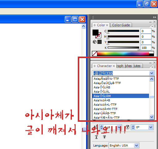 일러스터나 포토샵에서 서체고르기전에 글이 깨져요~