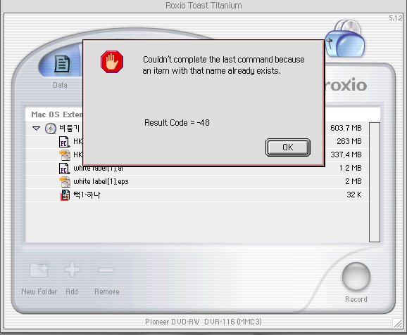 안녕하세요? 박노훈입니다. 구울 대상에 있는 파일들의 파일명 중에 특수문자 등이 포함되어 있으면 에러가 날 수 있습니다. 저 위의 이미지를 보면 괄호가 들어가 있어 그로 인한 문제일 수도 있으니 특수문자를 제거한 후에 레코딩을 시도해 보시기 바랍니다. 감사합니다. http://iplace.co.kr
